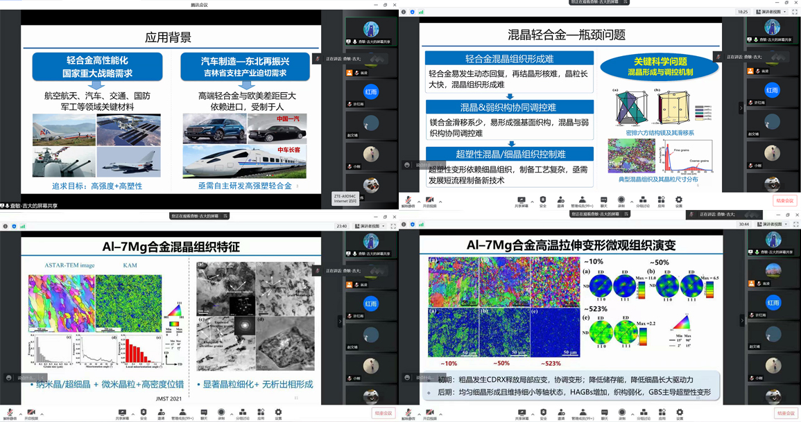 查敏教授首先介绍了高性能轻合金材料应用背景和战略需求,提出了混晶提升材料强塑性的思路和基本原理,然后结合自身的科研经历及取得的成果展开详细介绍。针对不同轻合金材料,查敏教授团队经过长期的研究,采用亚快速凝固技术和大压下量控轧技术成功制备了高强塑和高热稳定性的Al-7Mg、AZ91等新型高强塑混晶结构轻合金材料,并针对材料制备技术、微观组织演变及调控、室温和高温力学性能、强塑性机制、超塑性机制等进行了深入的研究。最后查敏教授对混晶结构轻合金材料领域的科研热点及应用前景进行了展望。