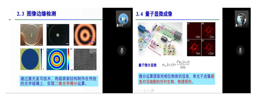 高玮教授首先对罗海陆教授的出席表示热烈欢迎和由衷感谢,并介绍了往年举办“国际光日”系列活动的情况。罗海陆教授深入浅出地讲解了基于光学微分运算的图像边缘检测与介电超表面实现光学微分运算等方面的原理和实现手段,并将其应用于量子显微和量子成像技术,在弱光、无光环境下,实现对待测目标无损伤、高信噪比、高精度边缘成像,最后对光学模拟计算在全光图像处理、显微成像、量子成像等领域中的可能发展方向进行了展望。整场会议学术氛围浓厚,在提问环节中,同学们踊跃提问并交流自己的理解,罗教授详细地回答了每一位老师和同学的问题,并对同学们热心好学的精神表示了肯定。
