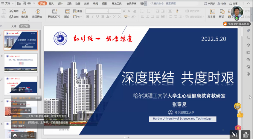 为了更好的促进家校联结,增强学生与家长、家庭与学校之间的有效沟通,将学校教育与家庭教育有机结合,形成教育合力,永利官网心理健康教育中心于5月20日19:00面向全体学生家长开展了“深度联结 共度时艰”主题心理健康教育讲座。讲座邀请国家二级心理咨询师、学校心理健康教师张泰复教授作为主讲嘉宾。讲座通过腾讯会议平台线上进行,共计300余名家长积极参与。