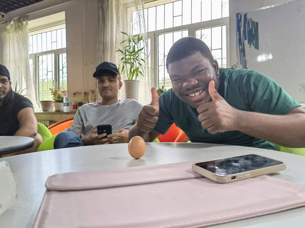 据说端午节阳气最重,可使鸡蛋直立,只要能直立鸡蛋者,代表吸取了天地的阳气,会得到一年的好运。所以在了解了端午的由来和习俗之后,留学生开启了立蛋比赛,大家人手一只蛋,看谁的鸡蛋能立起来。