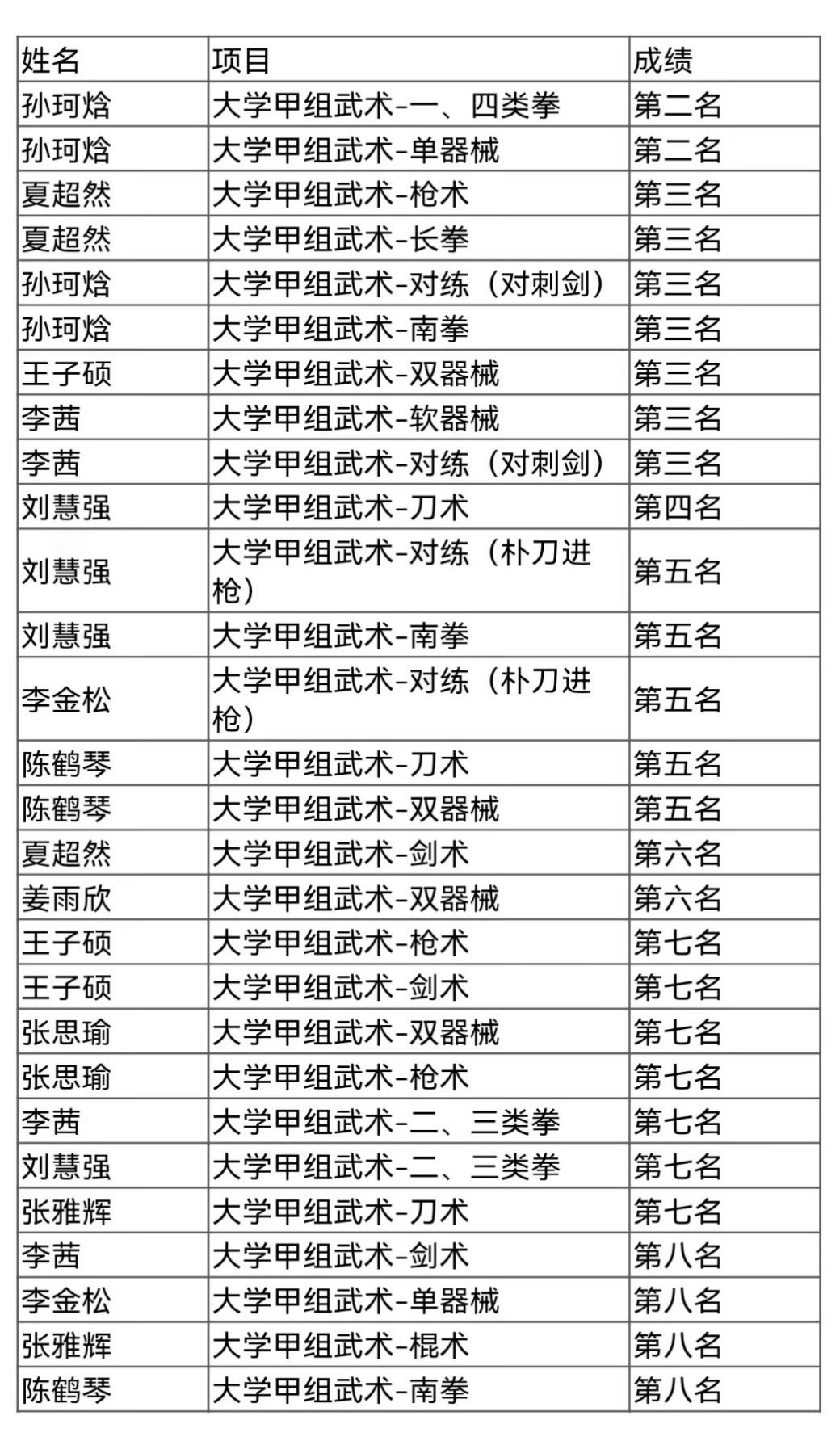 习武习德,以武强身。在健康第一的理念的引领下,传统武术始终以自己独特的光芒闪闪发光。这次学生运动会武术比赛不仅仅是运动员体力和技术的较量,更是精气神和心态的比拼,77779193永利官网武术代表队赛前刻苦训练,赛中心态稳定,克服了疫情影响、伤病减员、人少缺项等困难,在赛场上团结奋战、不畏强手、努力拼搏,最终获得二块银牌、七块铜牌、团体第四名的优异成绩,为本届学运会77779193永利官网代表团挣得103分的团体总分,可谓硕果累累。具体成绩如下: