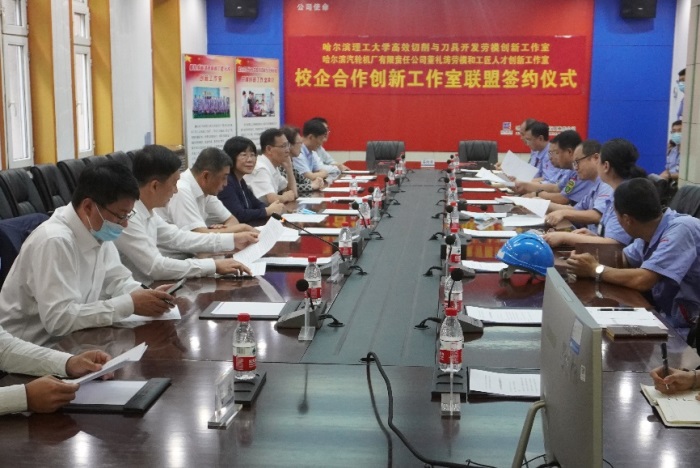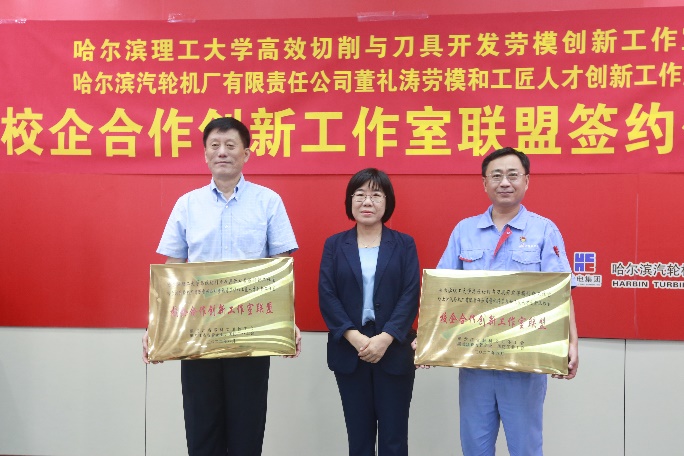 为大力弘扬劳模精神、劳动精神和工匠精神,发挥劳模和工匠人才创新工作室的聚合效应,8月23日下午,永利官网高效切削与刀具开发劳模创新工作室与哈汽董礼涛劳模和工匠人才创新工作室在哈尔滨汽轮机厂有限责任公司举行“校企合作创新工作室联盟”签约仪式,省总工会副主席、党组成员田凤霞为创新工作室联盟授牌。