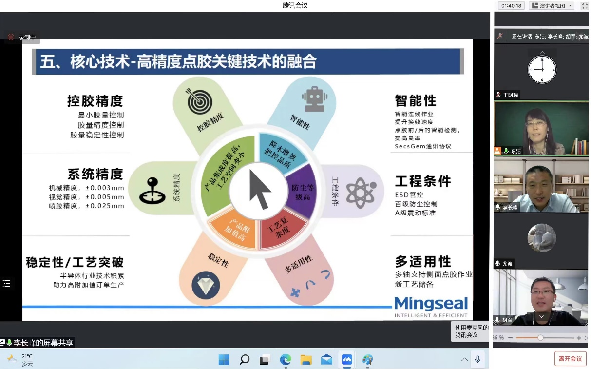 为加强产学研合作,拓展师生学术视野,了解行业前沿,推进控制科学与工程学科建设,应自动化学院邀请,常州铭赛机器人科技股份有限公司研发副总经理、永利官网兼职硕士生导师李长峰高级工程师,为我院师生作了题为“面向半导体和精密电子行业的点胶、焊接机器人系统解决方案及关键技术”的学术报告。2022年9月2日,主题报告通过腾讯会议线上举行。自动化学院胡军院长、李东洁副院长等学院班子成员、学科骨干教师及来自相关学院的200余名师生在线参会,报告由自动化学院副院长李东洁教授主持。李东洁副院长代表学院对李长峰高级工程师受邀报告,表示衷心的感谢,并鼓励我院师生积极抓住机遇,加强学术交流,瞄准学科前沿,提升科研能力,多产出高水平成果,为学科建设助力。