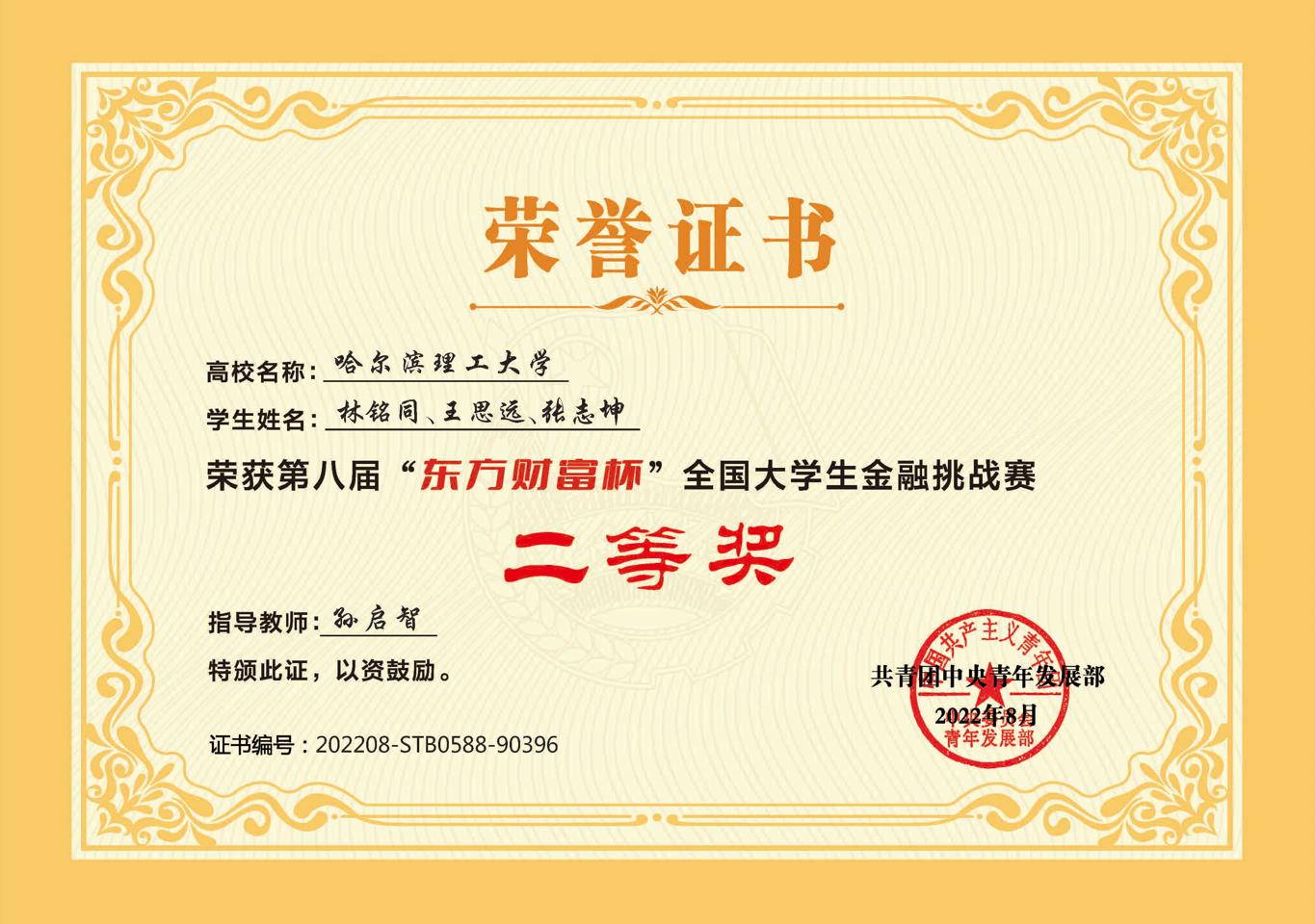 由共青团中央青年发展部主办,全国学校共青团研究中心、东方财富信息股份有限公司承办,以“燃财富梦想,登人生巅峰”为主题的第八届全国大学生金融精英挑战赛圆满落幕。永利官网学子经过三个月的精心准备和激烈比拼,最终获得国赛二等奖2项,省赛一等奖8项、二等奖14项、三等奖12项,校团委张奇同志获优秀领队奖,这是永利官网首次在全国大学生金融精英挑战赛中取得佳绩。