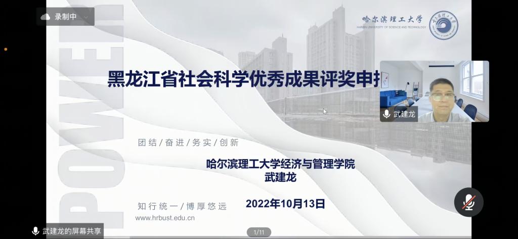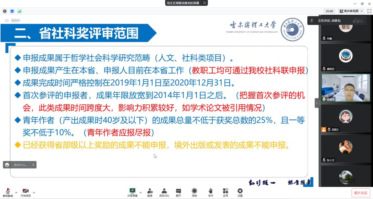 武建龙教授结合多年申报黑龙江省社会科学优秀成果奖的经历,分别从省社科奖的设置定位、评审范围、分类评价、申报系统填写、评审流程等几个方面作了详尽地讲解,交流了申报的经验和感受。他强调对于成果奖的申报要顶层设计、长远布局和对标积累高水平成果;要逐层申报,层层递进地进行每一级别奖项的申报;要聚焦学术前沿,面向经济社会发展主战场,开展高水平的研究。会上,武建龙教授回答了教师关于申报的相关问题。与会教师表示此次培训恰逢其时,对成果凝练和材料撰写具有很好的指导作用。