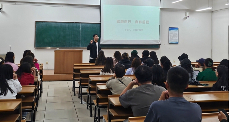 史成亮做题为《踏路而行,自有前程》讲座,首先史成亮结合自身学习、工作及跨专业就业的经历,分别从心怀感恩、胸怀梦想、奋斗青春这三个方面向学弟学妹们分享了自己在奋斗道路上的收获与感悟,还与大家分享了毕业后如何择业、就业,就业后人与人如何相处等问题。并希望师弟师妹们不管在什么岗位,从事什么行业都要填写好人生的履历表,交出事业的优秀答卷,为母校增辉添彩。
