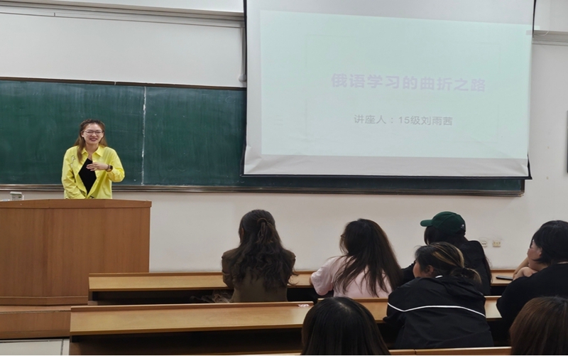 刘雨茜做题为《俄语学习的曲折之路》分享,在讲座中,阔别多年后重返校园,看见亲爱的学弟学妹们,她心情激动,思绪万千。首先,刘雨茜学姐就自身考研及从业经历、职场经验等方面阐述自己从“学渣”到学霸和公司业务骨干的奋斗历程;向学弟学妹们强调了应树立合理目标、掌握必要的知识与技能,在未来的实践与工作中善于发现并把握机遇,走出自己的舒适区。保持勤奋、学习、执着、抗压的良好学习态度和“坚定选择、调好心态”的长远发展理念。