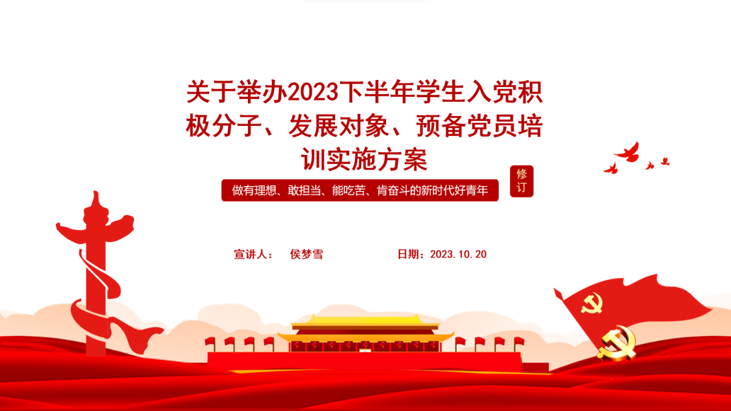 10月20日,测通学院召开了2023年下半年入党积极分子、发展对象、预备党员开班式,开班式由测通学院辅导员侯梦雪老师主持。她首先介绍了本次培训的目标和内容,并要求各位同学要端正入党的动机,以严肃认真的态度参与到培训中。她号召全体参训学员要以习近平新时代中国特色社会主义思想为指导,全面贯彻党的二十大精神,在思想上凝心铸魂,牢记党的宗旨,认真履行党员义务,坚定拥护“两个确立”、坚决做到“两个维护”,持续加强党的创新理论武装,坚持学思用贯通、知信行统一,把新时代中国特色社会主义思想转化为坚定理想、锤炼党性、指导实践、推动学习的强大力量。