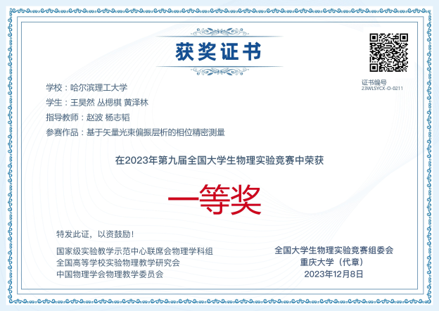 2023年全国大学生物理实验竞赛(创新)获奖证书