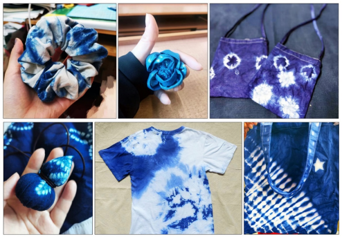 走进汪洋老师的《扎染课堂——和老师一起做扎染》课堂,首先感受到的是学生们专注的创作状态。汪洋老师为了避免传统手工艺在授课过程中的枯燥乏味,有意将“快乐扎染”这一理念引入课堂,紧紧围绕“快乐”一词安排扎染授课内容。从设计构思到扎花技法,再到染色技艺,每一个环节都设计一个创作小品,带领学生们亲自动手实践,并在实践过程中不断激发学生的想象力和创造力,使每位学生都参与其中,极大的增加了学生们的学习兴趣。用学生的话来说:“每当我拆扎花作品的时候就像在拆盲盒一样,很期待拆开后的样子,这个过程特别神秘,特别有趣。”