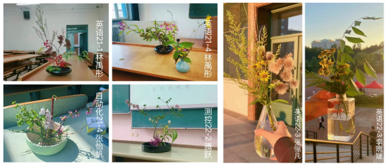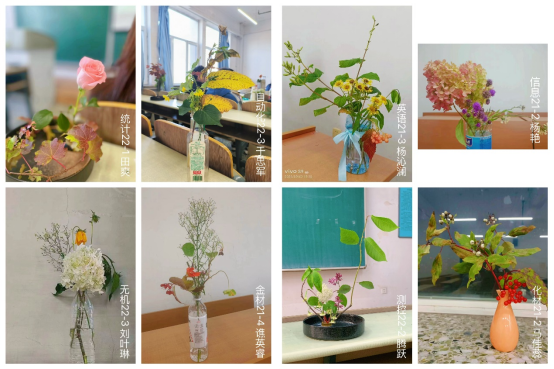 走进谭婕姝老师的《花艺》课堂,顿时让人们忘却烦恼,沉浸在美的世界里。《花艺》课程包含四个方面内容,首先是插花艺术理论,主要讲授中国插花艺术简史、中国花艺特质、中国插花类别等;其次是插花艺术基础,讲授花艺基本原理、花材、枝叶的折曲与加工技法;第三方面是插花艺术案例研究,包括如何插好一瓶中国式插花及中国插花的鉴赏;第四方面是花艺插制实践,在实践中会充分考虑中华民族文化艺术因素,学生通过作品表达着对美的诠释和追求,从一束花中折射中国文化自信。