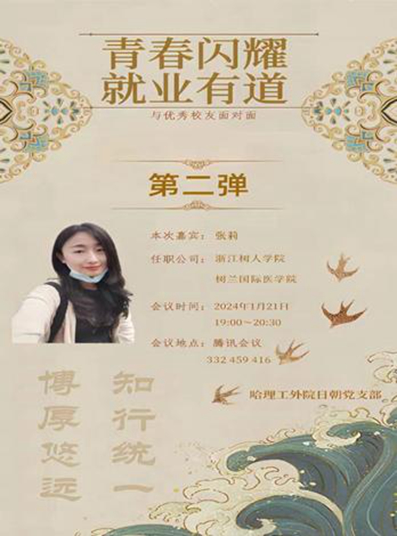 1月21日,党支部书记杨晔博士邀请了现就职于浙江树人学院树兰国际医学院的张莉作了题为“高校就职如何做好职业规划”的报告,拉开了系列活动的第二场。树兰国际医学院也是浙江大学的教学医院。张莉是永利官网2014级日语专业MTI笔译方向硕士毕业生,在学期间勤奋刻苦,成绩优异,能力突出。曾就职于哈尔滨工程大学水声工程学院、哈尔滨工业大学经济与管理学院。