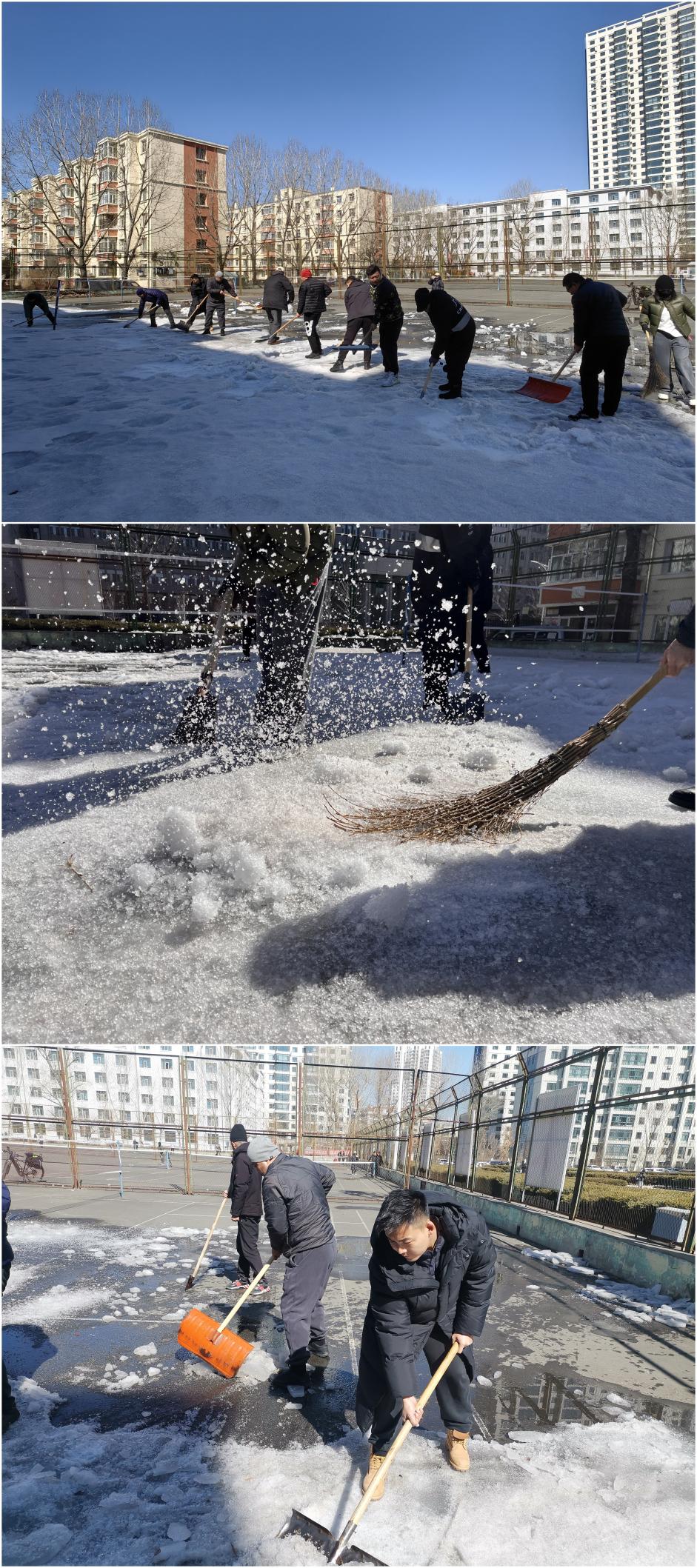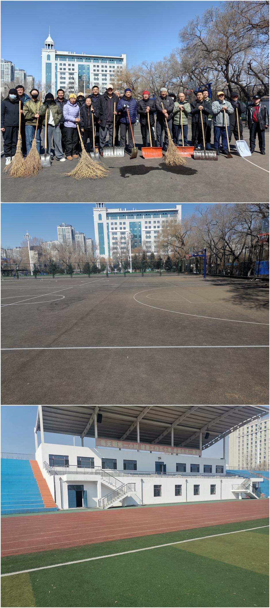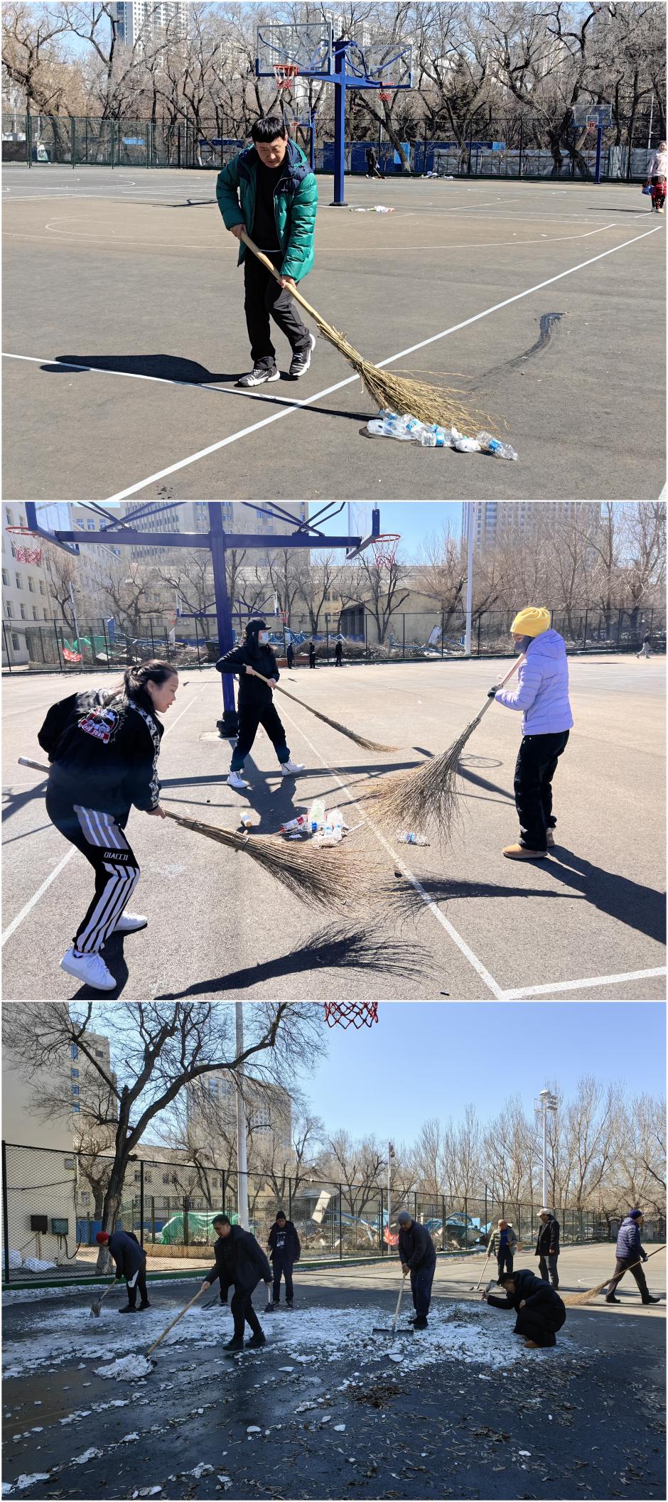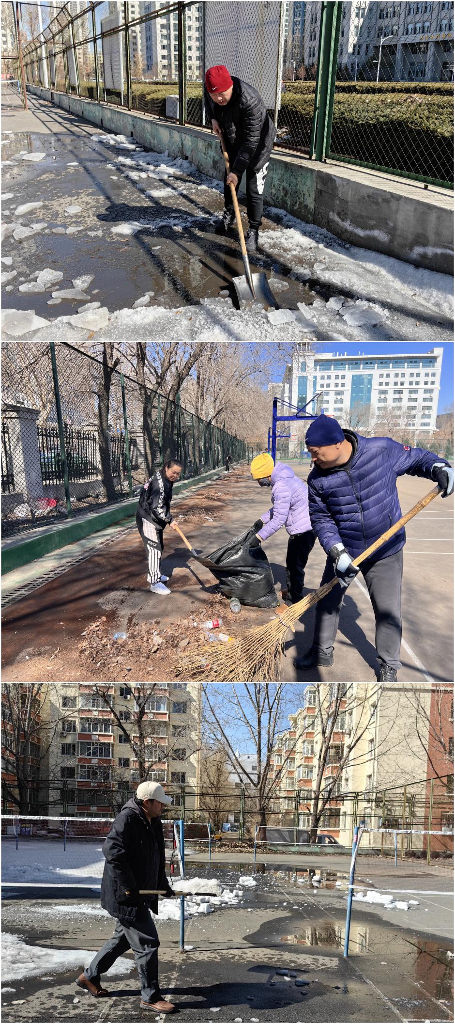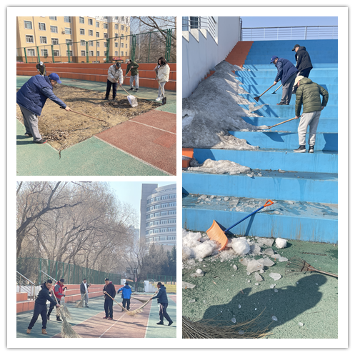 三月的校园尚有些春寒料峭,但体育教学部教职工不畏困难,在劳动中展示出了高涨的热情和昂扬的斗志。25日,部门班子成员、西区教研室全体教师以及办公室人员分别清理了网球场、毽球场以及篮球场的枯叶、垃圾和部分残余冰雪。26日南区教研室全体教师清理了南区田径场的杂物和部分残余冰雪。同志们在劳动中不怕脏、不怕累,干劲十足,最大程度保证本学期体育课教学能够顺利进行,同时校园环境得到了进一步提升,为全校师生营造了干净、整洁的体育锻炼氛围。