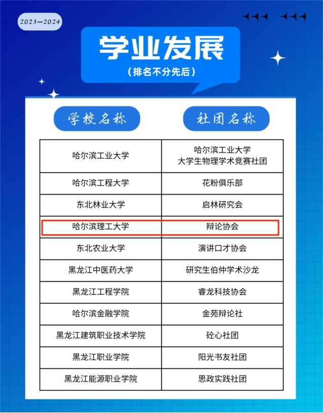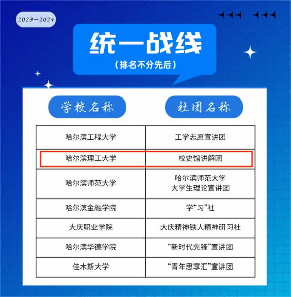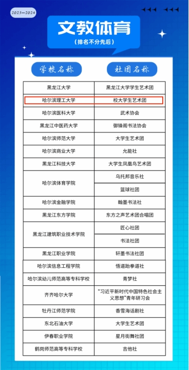 为进一步激发高校学生社团活力,充分发挥学生社团育人功能,团中央基层建设部指导中国青年报社开展2023-2024学年高校“活力社团”风采展示活动,集中展现高校学生社团创新经验做法。团黑龙江省委学校部、黑龙江省学联积极开展“活力社团”评选活动,日前,综合校内推选、活动展示页点赞、抖音视频展示情况,聚焦社团展示十大领域,结合各高校学生社团活动开展实际和事迹成果,校大学生艺术团、校青年志愿者协会、辩论协会、校史馆讲解团4个社团入选2023-2024学年黑龙江省高校“活力社团”TOP100榜!