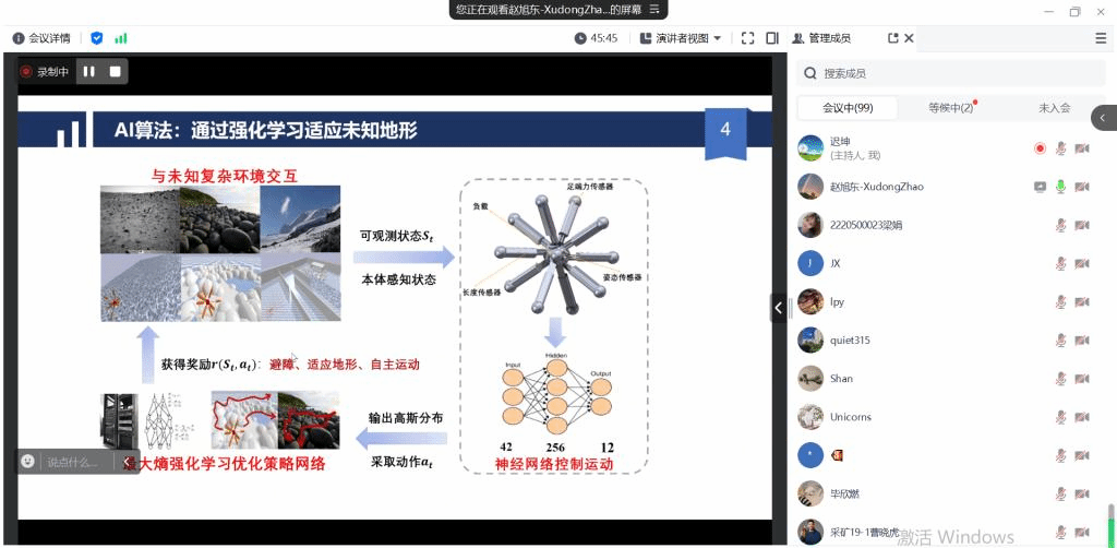 报告会上,赵旭东教授以复杂地形环境下隐蔽侦察任务的需求为切入点,介绍了仿生类无人系统的天然优势,及可快速部署并进入到有人作战无法或不便涉足的危险、恶劣环境和空间中等特点。报告中赵旭东教授主要详细介绍了仿海胆机器人研发中的若干研究结果,包括设计灵感及硬件结构设计、基于动力学的运动控制和规划、基于强化学习的运动控制、仿真及样机实验。