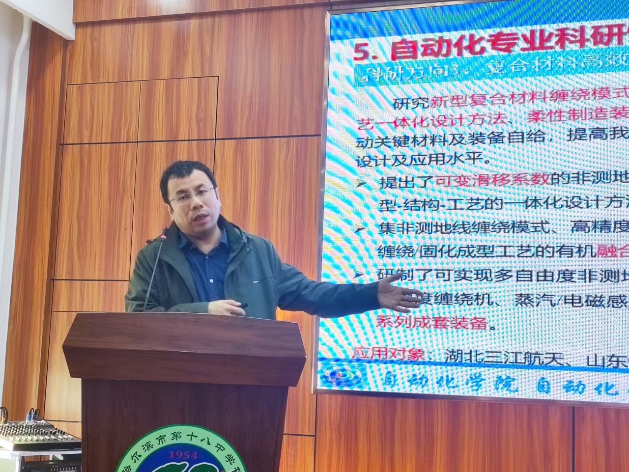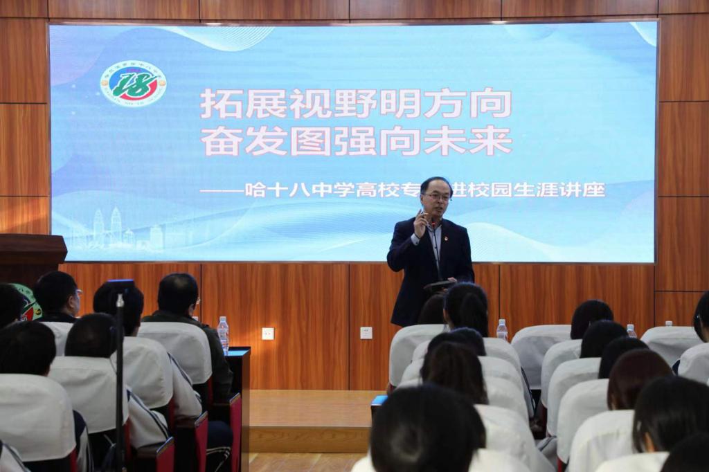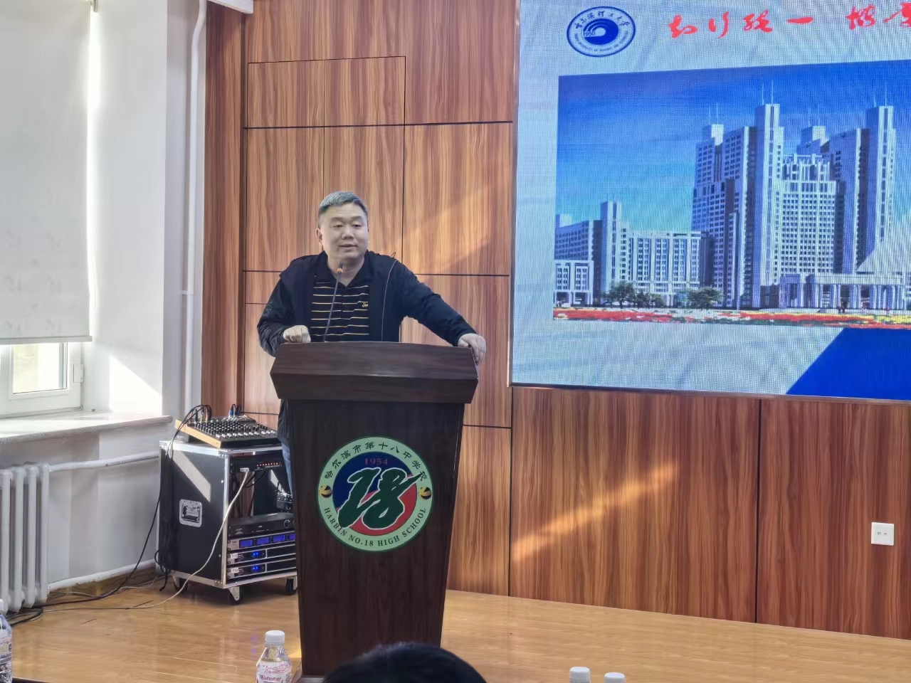 4月24日下午,学校教务处副处长李会军、经济与管理学院副院长姚锋敏、自动化专业负责人邓立为、教务处招生办公室主任刘鸿图一行赴哈尔滨市第十八中学开展“哈理工大讲堂”进高中活动。哈尔滨市第十八中学校党委书记王金福,校长潘毅,副校长张丽娜,教务处副主任宋春艳,生涯规划指导中心负责人李欣参加活动,100余名学生现场聆听讲座指导,500余名同学在线同步观看直播。