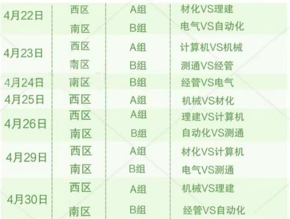 一年一度春草绿,正是强身健体时。本届比赛由体育教学部主办,材料科学与化学工程学院承办,体育教学部叶楠老师担任裁判长。在4月18日召开的领队会中叶老师进行了比赛相关事宜的讲解及抽签。最终,8支队伍的分组情况为A组:材化、计算机、机械、理建;B组:电气、测通、经管、自动化。小组赛赛程如下:
