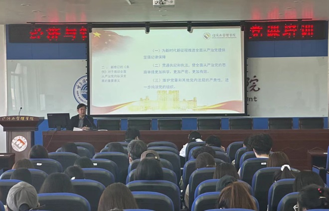 5月9日,党校举办《中国共产党纪律处分条例解读》专题辅导班,由学院党委书记周长群作专题辅导报告,全体学员线下参会,全体教工党员和学生党员通过腾讯会议线上参会。报告围绕新修订的《中国共产党纪律处分条例》,从《中国共产党纪律处分条例》的历次制定修改情况、新修订《中国共产党纪律处分条例》的重点条文、突出特征等方面,进行系统解读。周长群强调,全体党员要把遵规守纪刻印在心,筑牢政治忠诚,练就过硬本领,增强政治定力、纪律定力、道德定力、抵腐定力,增强“四个意识”,坚定“四个自信”,坚定拥护“两个确立”、坚决做到“两个维护”,确保党纪学习教育取得实实在在的成效。