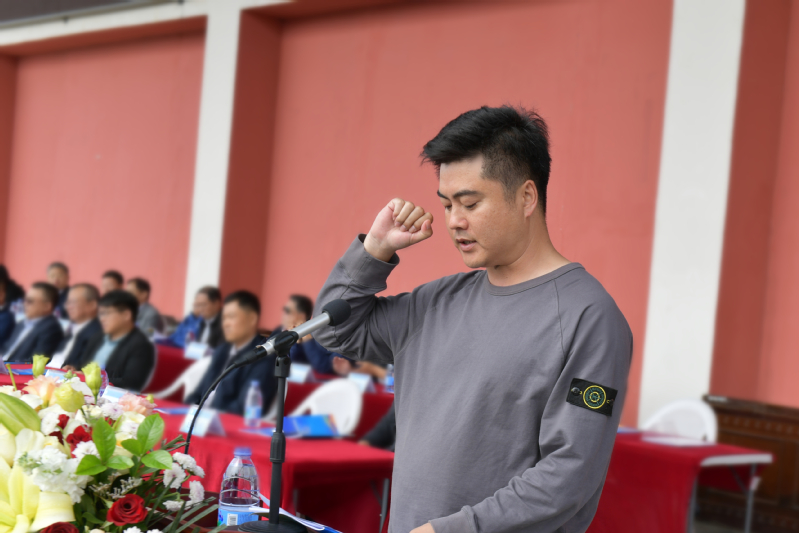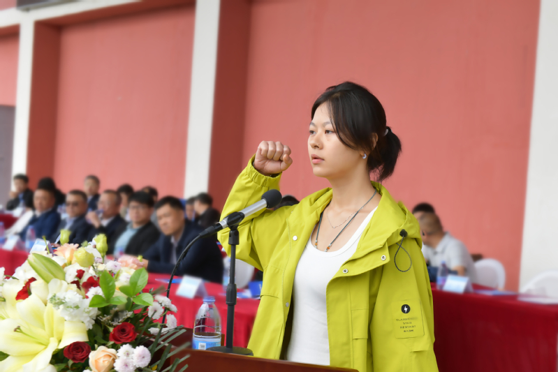 环境艺术22级2班张馨冉同学代表运动员郑重宣誓,严格遵守赛事的各项安排,遵守比赛规则和赛场纪律,赛出风格、赛出水平;体育教学部毕宏伟老师代表裁判员郑重宣誓,严格遵守竞赛规则和裁判员纪律,尊重参赛运动员,礼貌裁判,严肃认真,圆满完成各项裁判工作。
