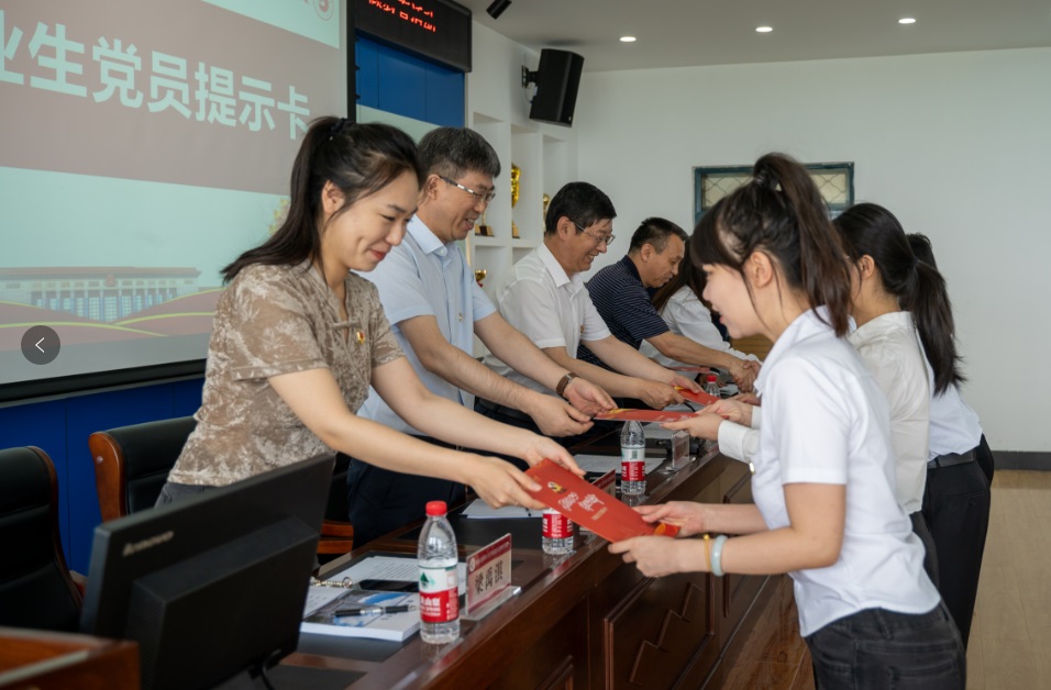 接下来,毕业生党员代表曲昀佳宣读了个人入党志愿书,分享了自己的入党谈话经历。通过重温入党志愿书和入党谈话,全体毕业生党员表示,离开学校后会一如既往地坚定理想信念,高举信仰旗帜,常思入党初心,做到初心不改、践诺一生,无愧于共产党员的光荣称号。随后,在毕业生党员代表吴晓鹏的领誓下,现场全体党员面向党旗,举起右手,紧握成拳,庄严宣誓。重温誓词结束后,学院领导及毕业班辅导员老师为毕业生党员代表胡中冠、张玲宵、马宏达、张辉、田韵新、李岳彤,发放“党员提示卡”。一张张鲜红的“党员提示卡”承载了学院对毕业生党员的殷切嘱托,希望他们严格要求自己、做好表率,让青春之花在祖国大地上绚丽绽放。