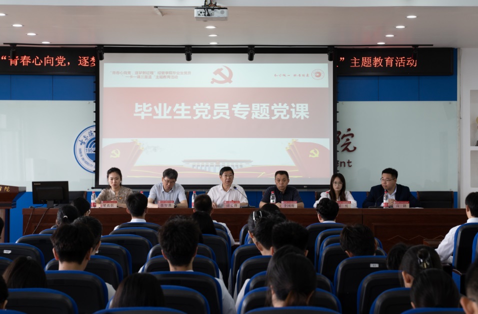 为切实加强毕业生党员党性教育,引导毕业生党员坚定理想信念,发挥先锋模范作用,6月14日9时,经济与管理学院于南区1号楼740会议报告厅开展“青春心向党,逐梦新征程”毕业生党员“一卡一课三重温”主题教育。学院党委书记周长群、党委副书记李国辉、毕业班辅导员张智洪、吴悦、梁禹淇及2024届全体毕业生党员参加本次活动。会议由学院党务辅导员、本科生辅导员高铭主持。