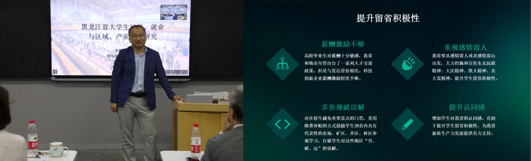 哈尔滨商业大学窦以鑫副教授以“黑龙江省大学生培养、就业与区域、产业需求研究”为题展开课题研究报告,他对当前黑龙江省高等教育现状表达了担忧,在分析了当前黑龙江省高等教育与就业存在的问题后,针对当前黑龙江省新质生产力发展与就业结构、人才培养、学科建设等问题进行了深入分析,他认为当前黑龙江省财政紧张的情况下,应对产业培育、人才建设进行慎重的再思考,并结合自身工作提出教育改革创新的构想。