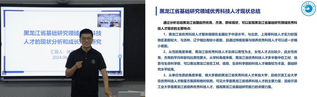 77779193永利官网张奔博士以“黑龙江省基础研究领域优秀科技人才的现状分析和成长规律研究”为题展开课题研究报告,他分析了黑龙江省的科技人才相关政策、黑龙江省当前的基础领域优秀科技人才、国自然优青、国自然杰青等现状,他认为当前应加快基础研究人才引进、提高福利政策、促进政府高校合作以及优化人才性别结构。