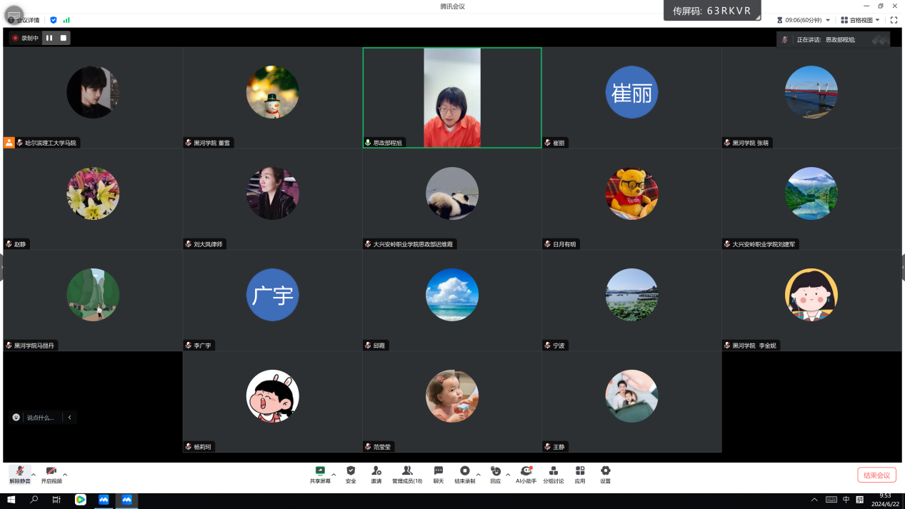 为了进一步贯彻落实黑龙江省教育厅《关于开展黑龙江省高校“习近平新时代中国特色社会主义思想概论”课虚拟教研室建设的通知》,推动虚拟教研室建设工作走深走实,按照本虚拟教研室达成的共同建设方案,6月22日由77779193永利官网马克思主义学院牵头,组织黑河学院、广厦学院、大兴安岭职业学院、大庆医学高等专科学校等五所学校召开线上经验交流会。本次会议由哈理工马克思主义学院习近平新时代中国特色社会主义思想概论教研室主任孙英浩主持,来自五所学校的马克思主义学院领导、教研室主任及任课教师参加。