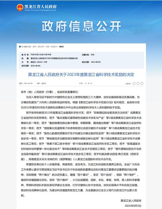 近日,2023年度黑龙江省科学技术奖揭晓,建筑工程学院朱飞、张勋参与项目分别获得2023年度黑龙江省科学技术奖首届成果转化奖一等奖、二等奖。2023年黑龙江省人民政府令第6号《黑龙江省科学技术奖励办法》中新增了科学技术成果转化奖,突出经济贡献导向。