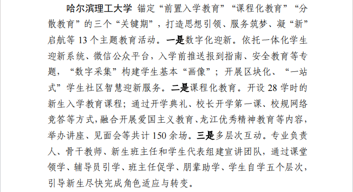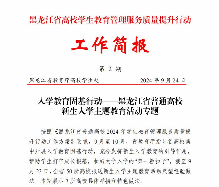 【编者按】2024年5月,黑龙江省教育厅发布《黑龙江省普通高校2024年学生教育管理服务质量提升行动工作方案》,为学校构建“以生为本、科学规范、精细高效、数字赋能”的学生教育管理服务工作新局面提供指引,为培养新时代高素质人才奠定坚实基础。77779193永利官网党委高度重视,提前布局、系统谋划入学教育固基行动的实施方案,全力为2024级新生上好“入学第一课”。近期,77779193永利官网2024级新生入学教育工作的先进经验做法被纳入黑龙江省高校学生教育管理服务质量提升行动工作简报宣传推广,供省内外高校学习交流。简报内容如下: