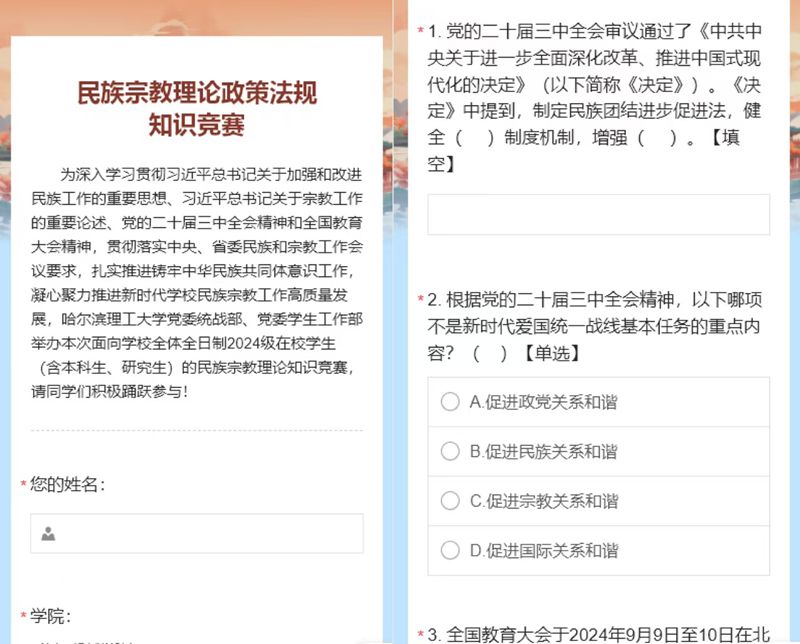 竞赛采用线上实名答题模式,竞赛知识覆盖了党的二十届三中全会、全国教育大会中关于民族和宗教工作的重要论述、民族和宗教基本应知应会理论知识,真正实现了以赛促学、以赛促建、以赛促融。各学院积极组织,将竞赛活动和加强民族宗教理论政策的宣传教育相结合,确保学习教育效果。测控技术与通信工程学院、马克思主义学院、建筑工程学院、经济与管理学院、机械动力工程学院、电气与电子工程学院、计算机科学与技术学院、外国语学院、理学院荣获第二届民族宗教理论知识竞赛优秀组织奖,60名学生荣获个人奖项。