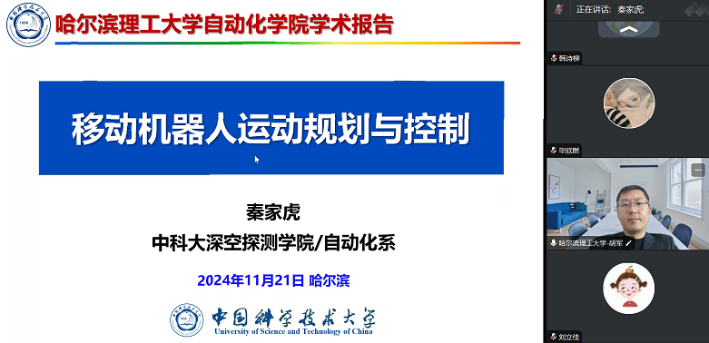 为拓宽我院师生科研视野、促进院校间学术交流,应自动化学院邀请,2024年11月21日,国家杰青、优青、中国科学技术大学博士生导师秦家虎教授作了题为“移动机器人运动规划与控制”的学术报告。报告会由自动化学院院长胡军教授主持,学科方向带头人、骨干教师、相关学院教师及硕博研究生等90余人在线参会。