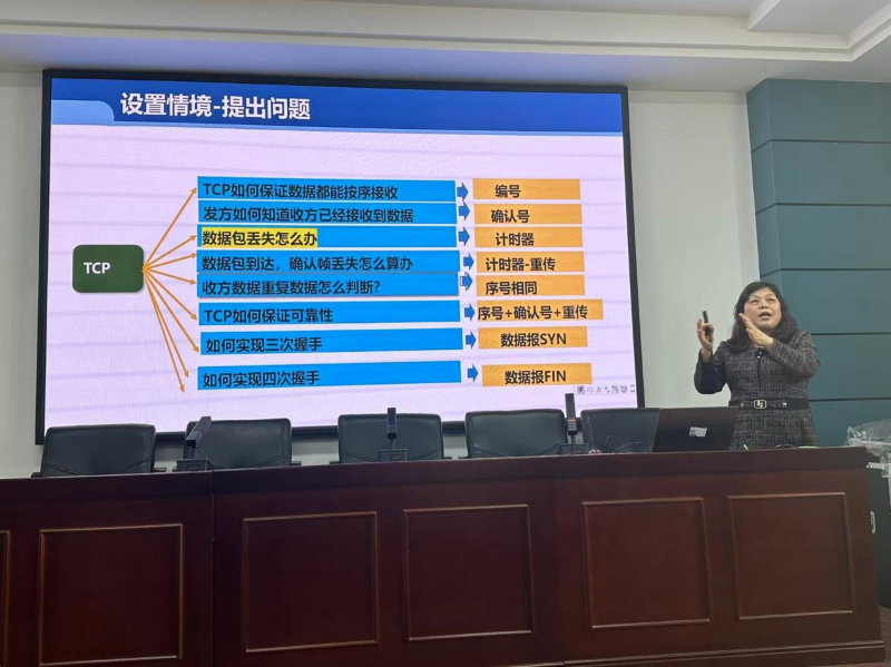 由省级一流课程负责人任相花副教授进行“计算机网络课程线上线下混合式教学的实践与思考”讲座。任老师以《计算机网络》课程线上线下混合式教学为例,提出以学生为中心,以信息技术为媒介,改进传统教学模式,介绍了混合教学模式在计算机网络课程应用时,线上教学资源建设、线下课堂教学、实验教学和课程思政设计、学习效果评价、线上线下互动与反馈等。任老师强调完善线上教学资源,丰富视频学习、随堂测试、在线讨论、章节测试等内容,学生可以根据自身学习能力及知识获取能力进行自主学习;在课堂教学中每次课都要设置适合的情境,以问题为驱动,将知识融入到情境中,随着问题的逐一破解,让学生主动地动脑、动口、动手,从本质上解决了学生学习动力不足的问题。