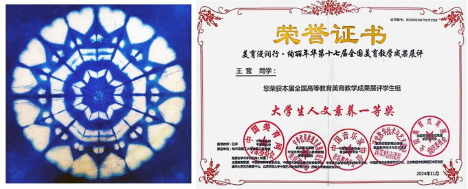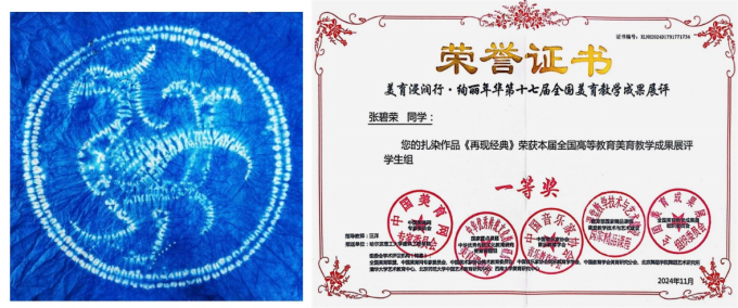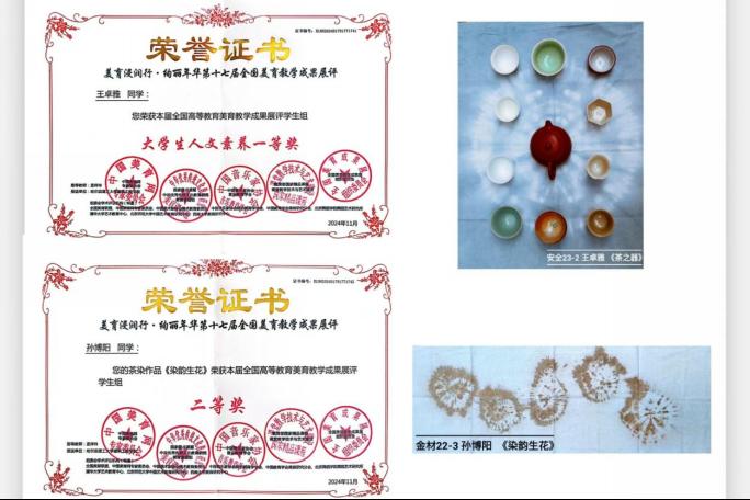 在这些课程中,永利官网学生们不仅学会了传统技艺的精髓,更在创作与实践中培养了独特的审美情趣与创新精神。他们用自己的双手,将传统文化与现代审美相结合,创造出了一系列令人瞩目的作品与成果。例如,在全国美育联盟、中国美育网专家委员会等多个权威单位主办的“美育浸润行·绚丽年华第十七届全国高校美育教学成果展”评选中,汪洋老师悉心指导材料与化工学院的王营同学创作扎染作品《爱的传承》,荣获大学生人文素养一等奖;经济管理学院的张碧荣同学的扎染作品《再现经典》则以其扎实的基本功与高难度的扎花技艺赢得了评委们的高度认可与赞誉,荣获了大学生作品一等奖;孟祥玲老师指导的茶席设计作品《茶之器》荣获大学生人文素养一等奖;插染作品《染韵生花》荣获了大学生作品二等奖,这些荣誉不仅是对学生们努力的肯定,更是对永利官网美育课堂教育成果的认可。