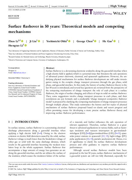 Zhen Li, Ji Liu, Yoshimichi Ohki, George Chen, He Gao, Shengtao Li, Surface flashover in 50 years: Theoretical models and competing mechanisms, High Volt., 2023, 8(5), 853-877.