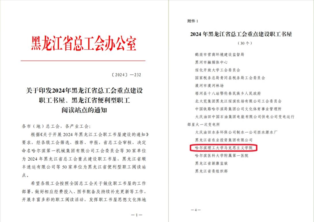 近日,省总工会重点建设职工书屋审核评选结果揭晓,永利官网申报的马克思主义学院职工书屋获批“2024年黑龙江省总工会重点建设职工书屋”。