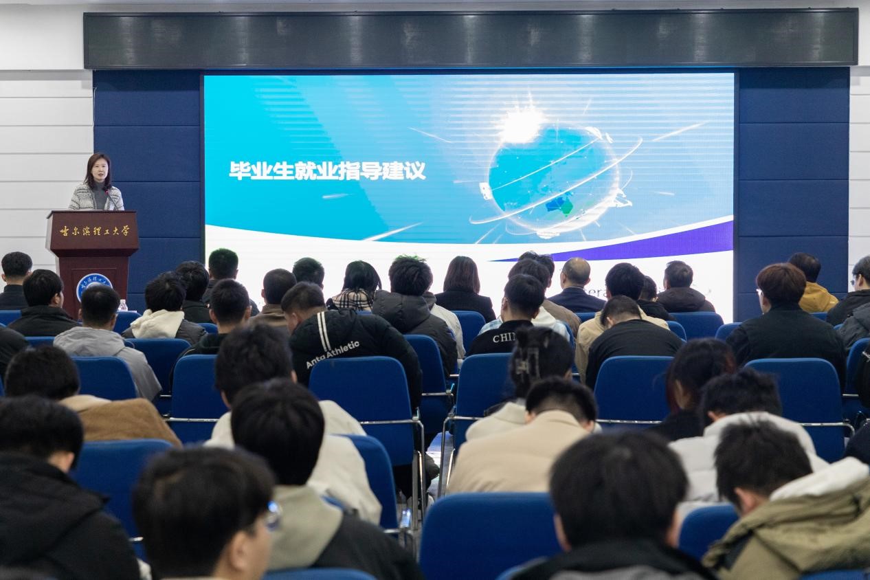 随后,学校就业服务中心甄志勇副教授作就业形势分析报告,结合相关数据和行业动态,从区域经济发展、产业结构调整、人才需求变化等方面深入分析了当前的就业形势,解读相关政策。哈尔滨海能达科技有限公司招聘经理杨洋为参会学生开展了一场精彩的毕业生就业指导讲座。她以自身丰富的职场经验为切入点,从职业定位、能力提升、求职技巧等方面为同学们提供了实用的指导。她鼓励同学们要立足实际,明确目标,注重积累,在实践中不断探索,找到适合自己的职业发展道路。会议最后,哈尔滨海能达科技有限公司技术总监李志洋立足通信技术革新趋势,以“专用通信·新时代机遇”为主题面向在场200余名应届毕业生作专场招聘宣讲,系统介绍企业研发体系、岗位需求及人才培养方案。