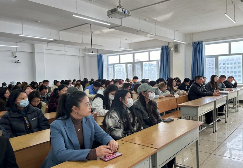 金丽欢结合目前就业环境作就业形势分析报告。她指出当前就业形势依然严峻,存在岗少人多的情况,毕业生们应紧抓就业时机,主动关注招聘信息,利用校内外资源提升职业技能。她强调,学生应消除就业恐惧心理,发挥主观能动性,提高心理承受能力,克服求职心理障碍。张岩芳主要围绕公职类就业面试具体流程、基本考情、题型占比、应对思路及简历制作五个方面进行讲解。在讲解的同时,也帮助学生进一步思考及确定自身的职业发展方向。她鼓励学生要增强自身本领,保持积极心态,勇敢面对各种挑战和竞争。