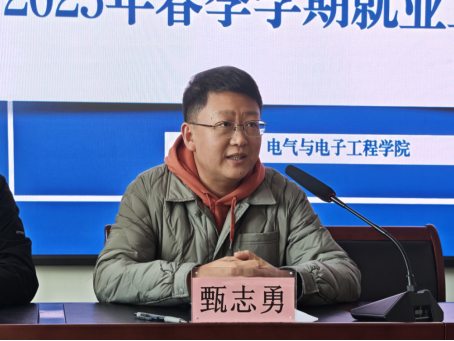 为全面落实教育部及省教育厅关于2025届高校毕业生就业工作的相关部署,紧抓春季就业促进的关键时期,电气与电子工程学院于3月24日下午在教学主楼G1012召开2025年春季学期就业工作推进会。学院院长刘骥、党委书记单鹂娜,校党委学生工作部大学生就业服务中心甄志勇老师,江苏华朋集团有限公司人事经理金华、事业部主任潘晨,电气与电子工程学院学生工作办公室主任、2021级本科生辅导员刘书齐老师,2022级研究生辅导员李放老师出席会议,2025届未就业毕业生参加会议,会议由2021级本科生辅导员于牟金泽主持。