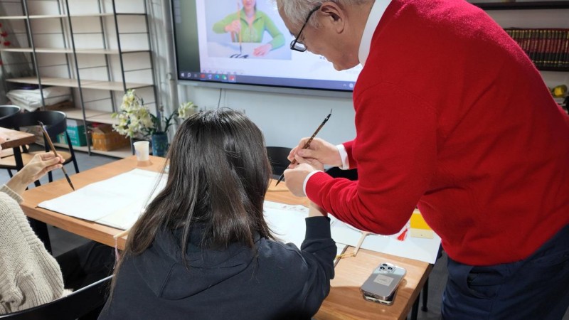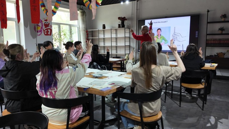 理论讲解结束后,实践环节正式展开。周斌教授亲自示范,带领留学生们学习书法执笔姿势。为让大家更直观感受中国文化,周斌教授以最具中国传统吉祥寓意的“福” 字为教学内容,指导大家书写篆书“福”字。运笔过程中,周斌教授着重演示了篆书中藏锋这一重要笔法,许多留学生都是首次接触毛笔,一笔一划间,古老书法的精妙在异国学子笔下缓缓流淌,课堂里只剩下笔尖摩挲宣纸的沙沙声与此起彼伏的赞叹。