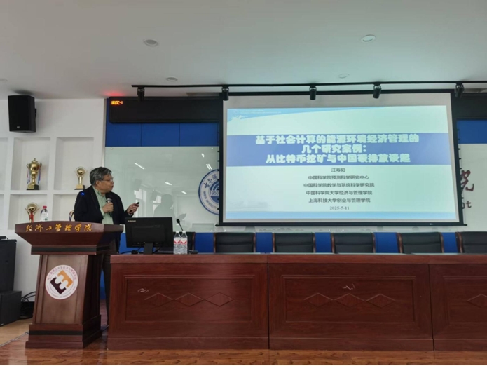 汪寿阳教授报告主题为“社会计算背景下的环境经济管理的几个研究案例:从比特币挖矿与中国碳排放谈起”。他凭借深厚的学术功底和丰富的研究经验,以比特币挖矿与中国碳排放等研究作为实际案例,深入浅出地阐述了社会计算背景下环境经济管理领域的前沿研究成果与发展趋势。同时,结合其团队多篇发表在Science正刊、Science子刊、Nature正刊、Nature子刊上的高水平成果发表经历,生动的讲解了如何选择有趣的科学问题,如何服务国家战略需求,如何做顶天立地的科学研究。汪院士独特的见解和高瞻远瞩的洞察力,引发了在场师生的强烈共鸣和兴趣。在互动环节中,师生们积极提问,汪教授耐心解答,现场学术氛围热烈。