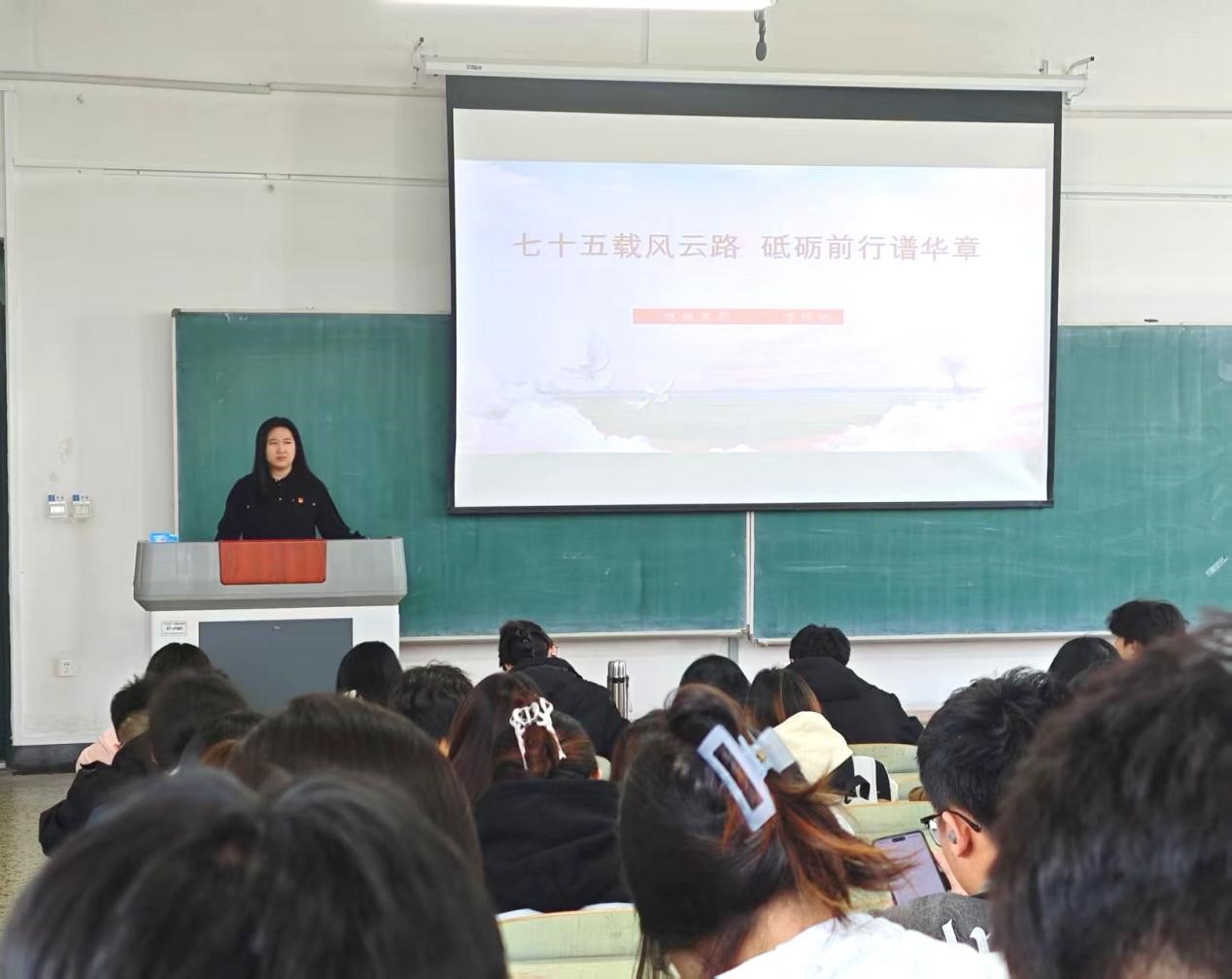 学院党务辅导员李玥桥老师以“七十五载风云路砥砺前行谱华章”为主题,以四个党史故事讲述先辈们的崇高精神,引导学生铭记历史,将红色基因代代相传,使革命精神永不磨灭,以爱国之情凝聚奋进之行,坚定信念、勇于担当、无私奉献,为实现中华民族伟大复兴的中国梦凝聚强大力量。
