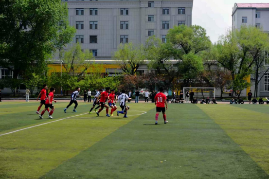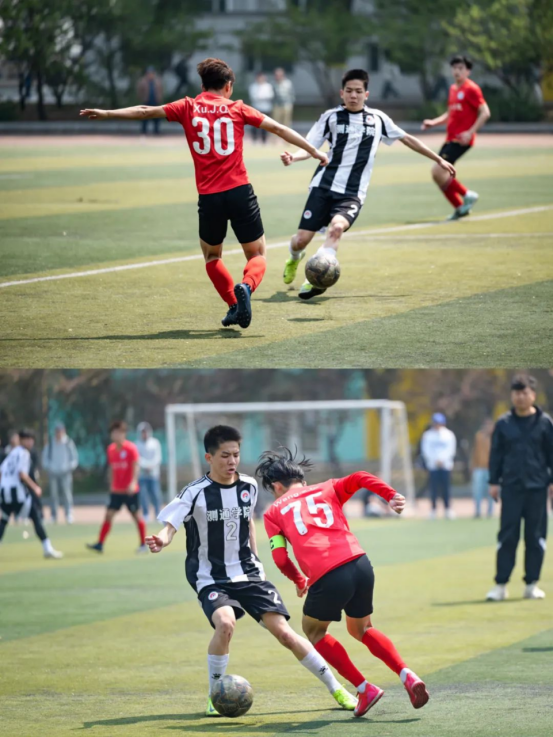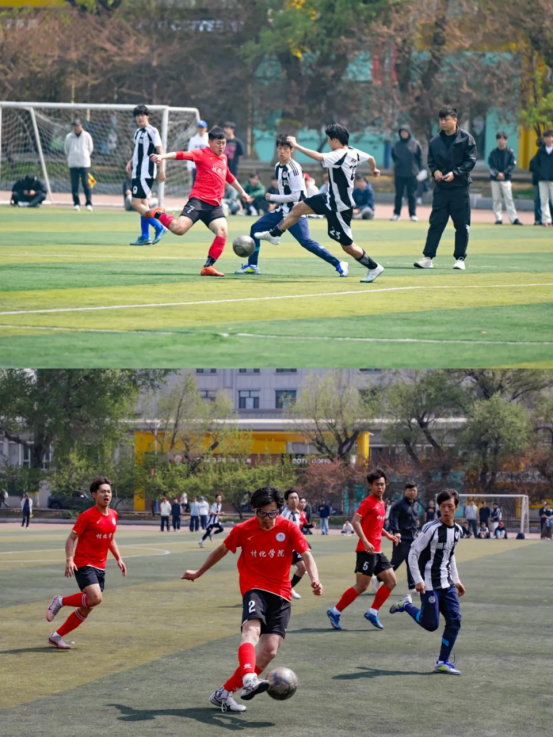 比赛中各学院足球队员展现出高超的球技和顽强的斗志。他们在场上灵活跑位、默契配合,时而精准传球,时而大力射门,每一次进攻都扣人心弦,每一次防守都坚如磐石。观众席上,同学们的加油声、欢呼声此起彼伏,为场上的球员们注入了无限动力。