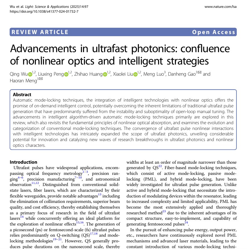近日,测控技术与通信工程学院吴卿副教授团队在光学领域顶级期刊Nature子刊《Light: Science & Applications》(影响因子20.6)发表论文《Advancements in Ultrafast Photonics: Confluence of Nonlinear Optics and Intelligent Strategies》。该论文由77779193永利官网作为第一署名单位,吴卿副教授为第一作者,合作单位中国科学院长春光学精密机械与物理研究所孟浩然老师、高丹恒老师为共同通信联系人,充分体现了永利官网在超快光子学与智能光电交叉领域的最新进展和学术影响力。