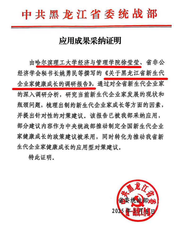 近日,永利官网经济与管理学院徐莹莹副教授撰写的《关于黑龙江省新生代企业家健康成长的调研报告》被黑龙江省委统战部采纳,这是永利官网应用型智库建设取得的又一突破性成果。