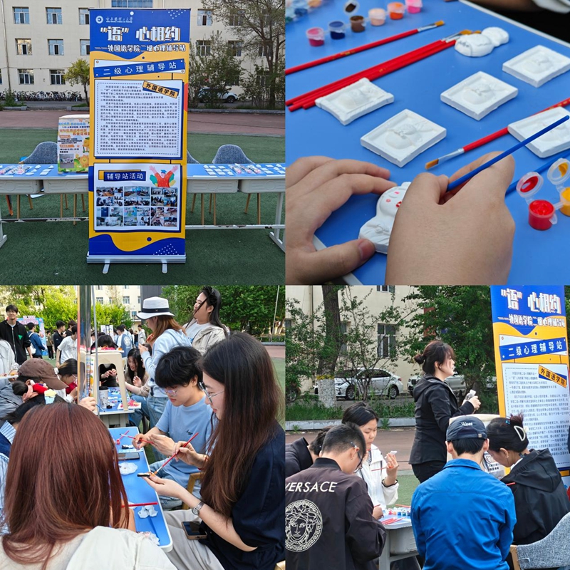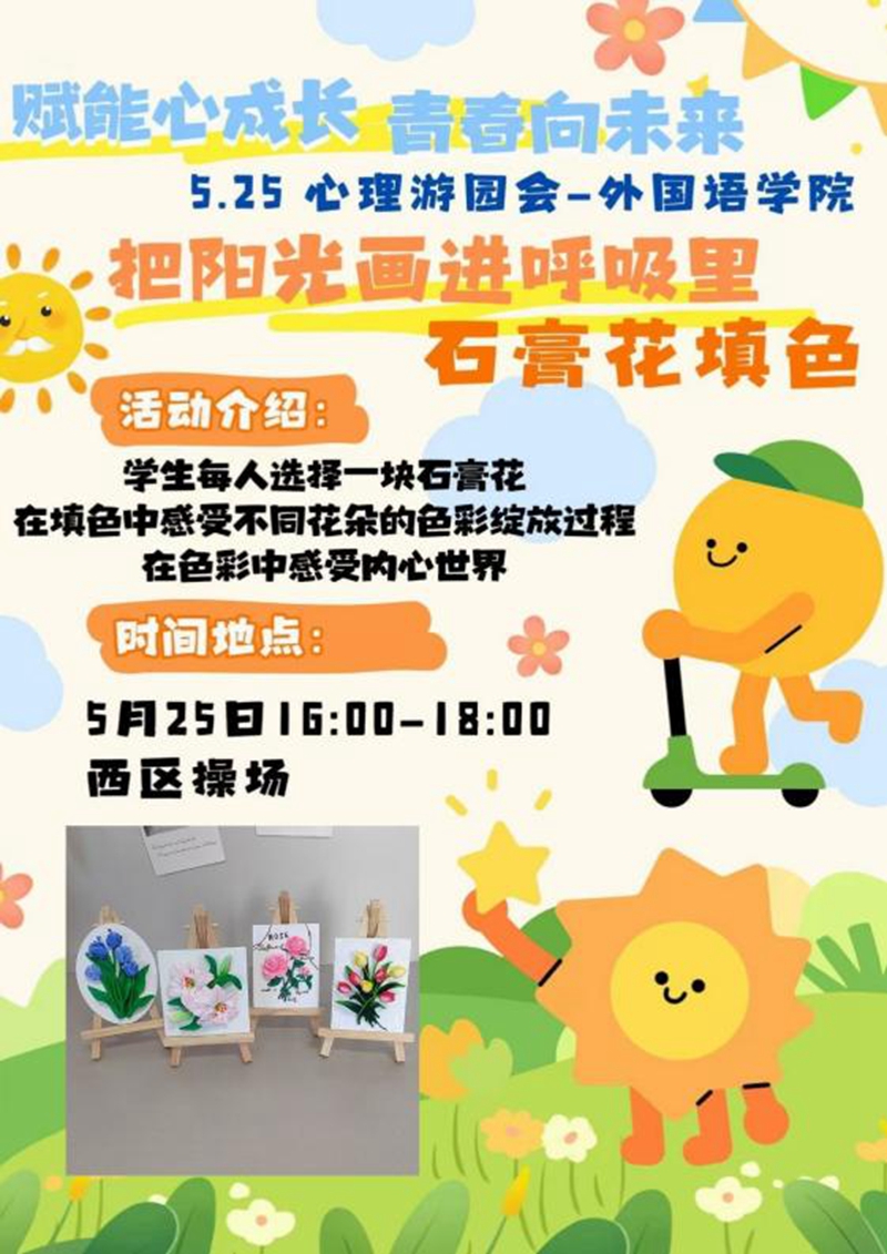 为迎接“5.25全国大学生心理健康日”,营造积极向上的校园心理文化氛围,响应学校“赋能心成长,青春向未来”心理游园会要求,外国语学院二级心理辅导站于5月25日在西区体育场开展“把阳光画进呼吸里——石膏花填色”活动。