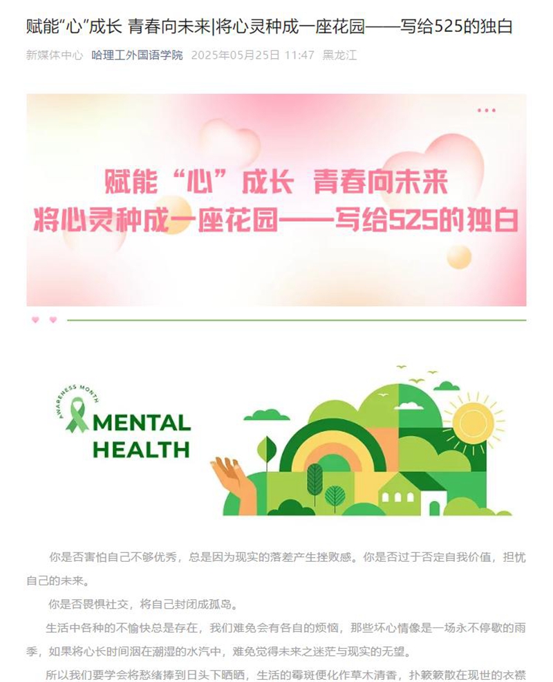 “心理健康活动日”是围绕心理健康开展的主题活动日,旨在提升公众对心理健康的关注,普及心理知识,促进心理成长。外国语学院于5月25日在“哈理工外国语学院”公众号内发布心理健康知识,其中包括心理健康的核心及科学自我关爱的三大维度。此次活动进一步宣传普及心理健康知识,增强大学生心理自我保护意识,提高心理调适能力。