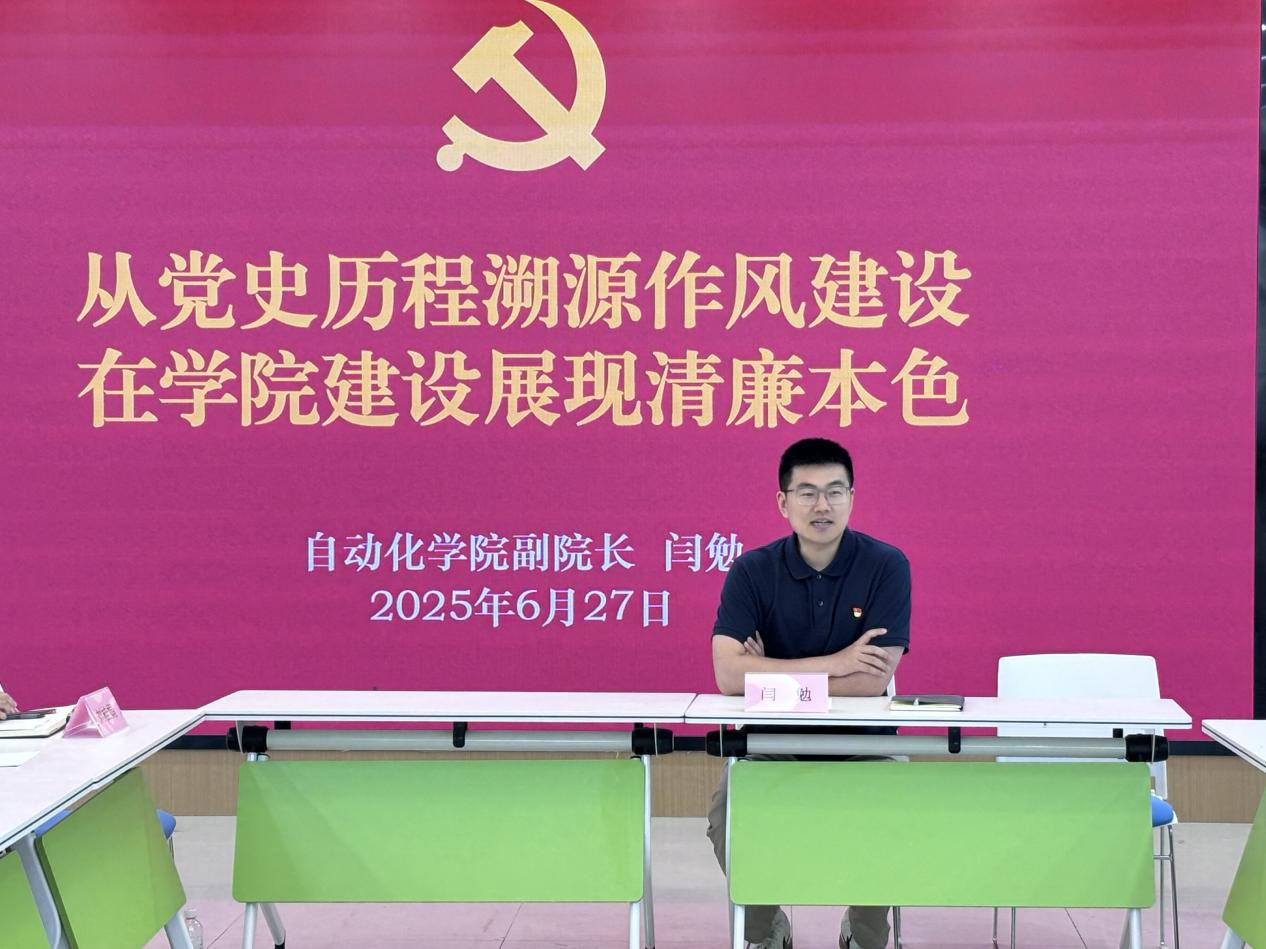 党史教育润心田,薪火相传谱新篇。学院副院长闫勉以《从党史历程溯源作风建设,在学院建设展现清廉本色》为题讲授专题党课。通过鲜活的历史画卷和详实的数据分析,深刻阐释了中国共产党人的精神谱系,他勉励学生党员,要始终做红色基因的传承者,在科技报国的赛道上跑出自动化人的加速度。
