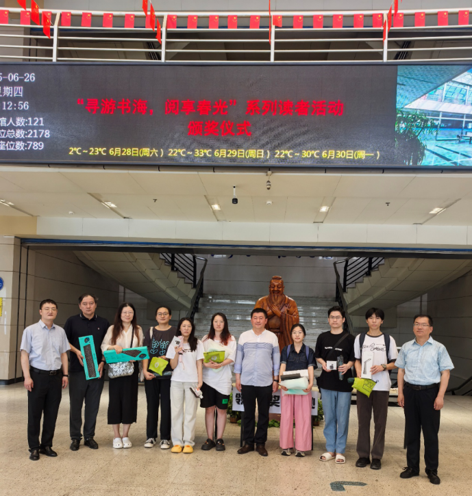 活动采用线上线下方式同时开展,共推出15个活动。线上板块有书海竞速、读书积分、知识问答挑战、师生书评大赛、荐书、阅读分享会等活动,线下设有精品书展、古籍展、阅读文化创意设计精品展等活动。系列活动融合知识性、趣味性与互动性为一体,不仅吸引了近千名师生参与,更在校园中营造了浓厚的阅读氛围。6月26日,图书馆举行颁奖仪式,表彰积极参加“寻游书海∙阅享春光”系列读者活动的师生代表。