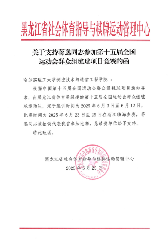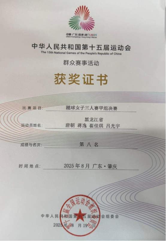 在刚刚过去的八月,永利官网毽球运动员测通学院测控24-4班蒋逸同学代表黑龙江省参加第十五届全运会(群众比赛),获得佳绩。